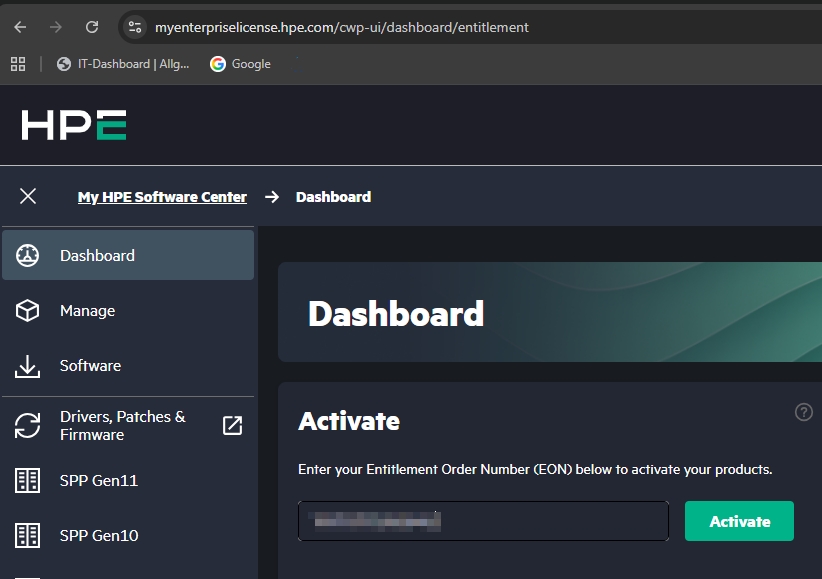 To assign licenses (iLO and COM) to your company and generate license keys, use the HPE License Portal. Log in, go to “Activate”, and enter the “Order Number” from your certificate or email.