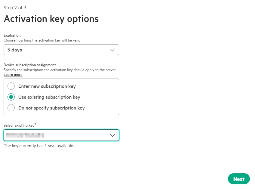 To get an „Activation Key“ for the server, select „Use existing…“ and select the key from the list above.