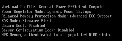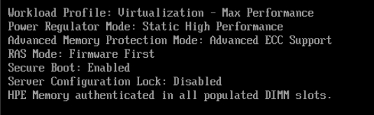 During boot, we see that „Workload Profile: General Power…“ and „Secure Boot: Disabled“ are enabled.