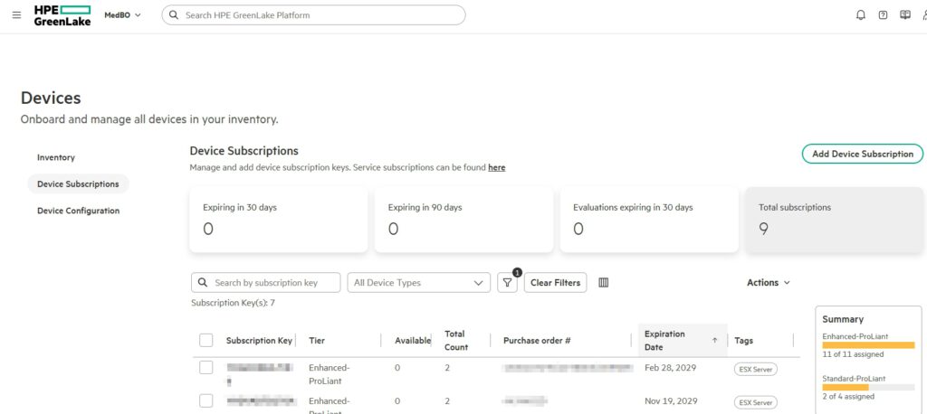 Now we need to add our COM license for the server (from the beginning). To do this, go to „Devices“ and select „Add Device Subscription.“ Alternatively, we can also assign a tag to the subscription so that we know what it’s intended for.