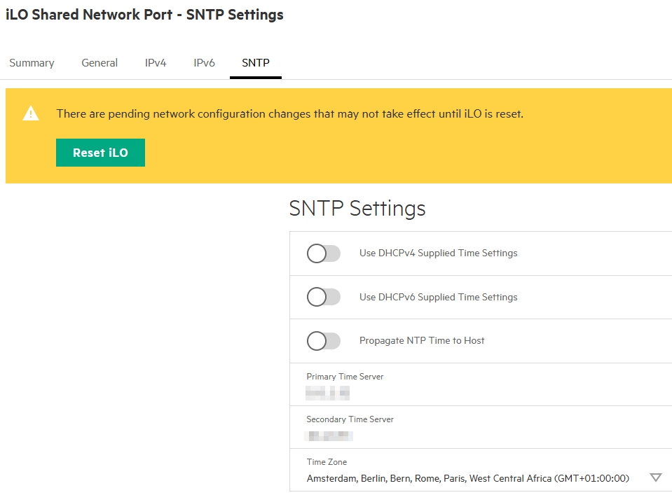 Under the network settings, we adjust the names, IP addresses, and also the time server. The time from the iLO is important because the secure connection to COM is established via certificates and these are not valid if the time is incorrect.