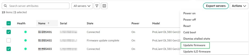 Then we select the required server(s) from the list of our servers and then under „Action,“ select „Update firmware.“